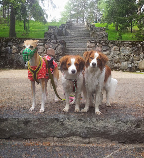 Kooikkereissa ei pahempia jumeja ollut, molemmilla löytyi jotain kiristystä pitkistä selkälihaksista ja lantiolta. Aurinkoisella oli taas kyljet jumissa (liekö ihme, kun se vetää hihnassa aina toispuoleisesti, eli pyrkii nojaamaan vuoron perään joko oikealle tai vasemmalle), Siriuksella sen sijaan etureidet ja polven seutu. Hierottaessa huomasin myös sen, että punkkimyrkky on nähtävästi auttanut, koska litkun laittamisen jälkeen Siriuksessa on ollut kiinni vain yksi punkki ja Aurinkoisessa ei yhtään. Lisäksi "takapihan" (eli lähiniityn) juoksutreenit ovat tuottaneet tulosta, molemmat kooikkerit ovat saaneet vähän lisää lihaksia jo parissa viikossa!
